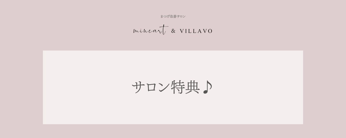 mineart & VILLAVOでは、来店ごとに使える特典や紹介割引、口コミ特典など、サロンをご利用いただくお客様に向けた限定サービスを多数ご用意しています。まつエク・まつげパーマ・眉毛メニューをお得に継続したい方におすすめです。