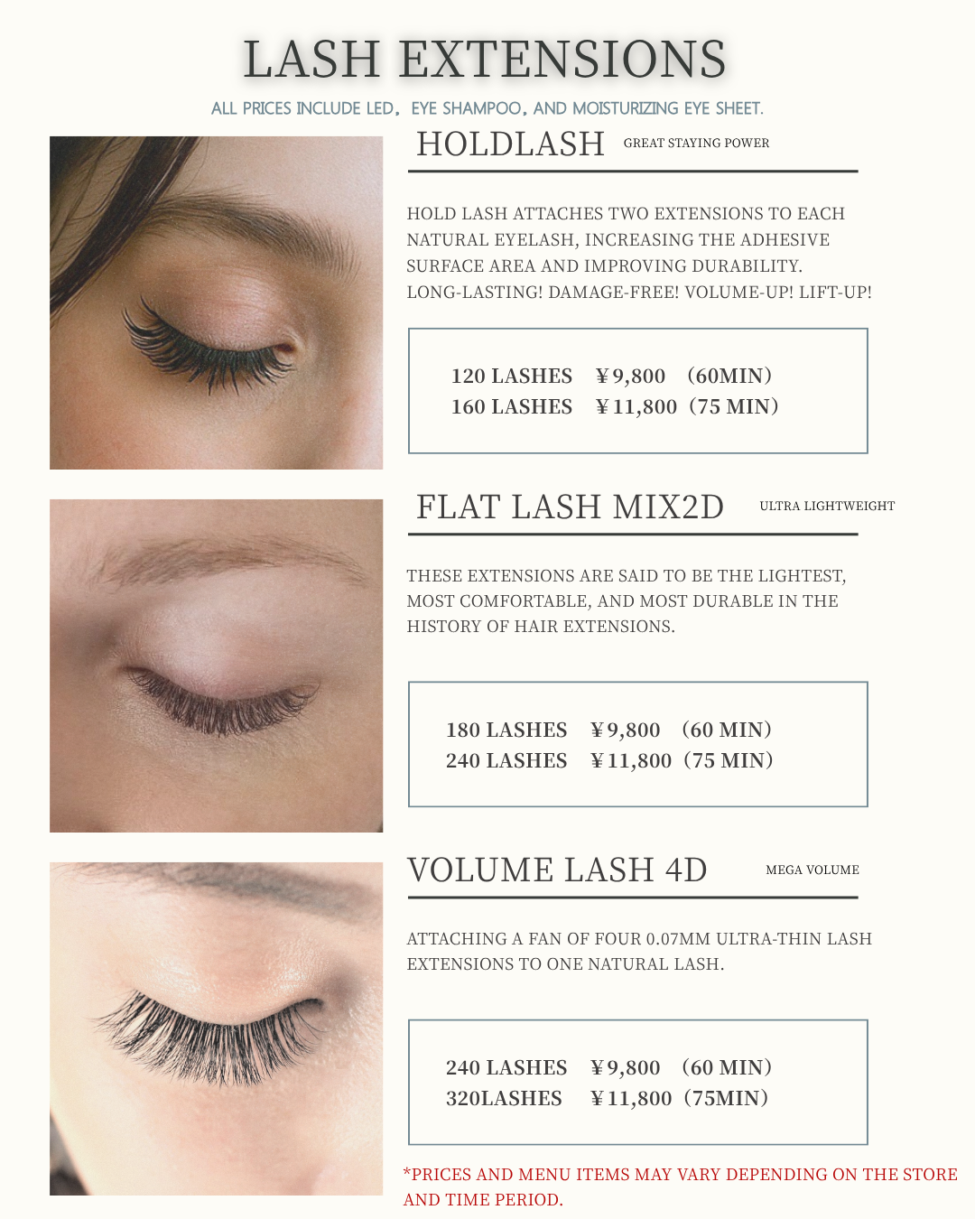 We are currently preparing other services besides eyelash extensions. Please note that prices and available services may differ depending on the season, promotions, or the salon location. For details, kindly refer to the online booking page of your chosen salon.