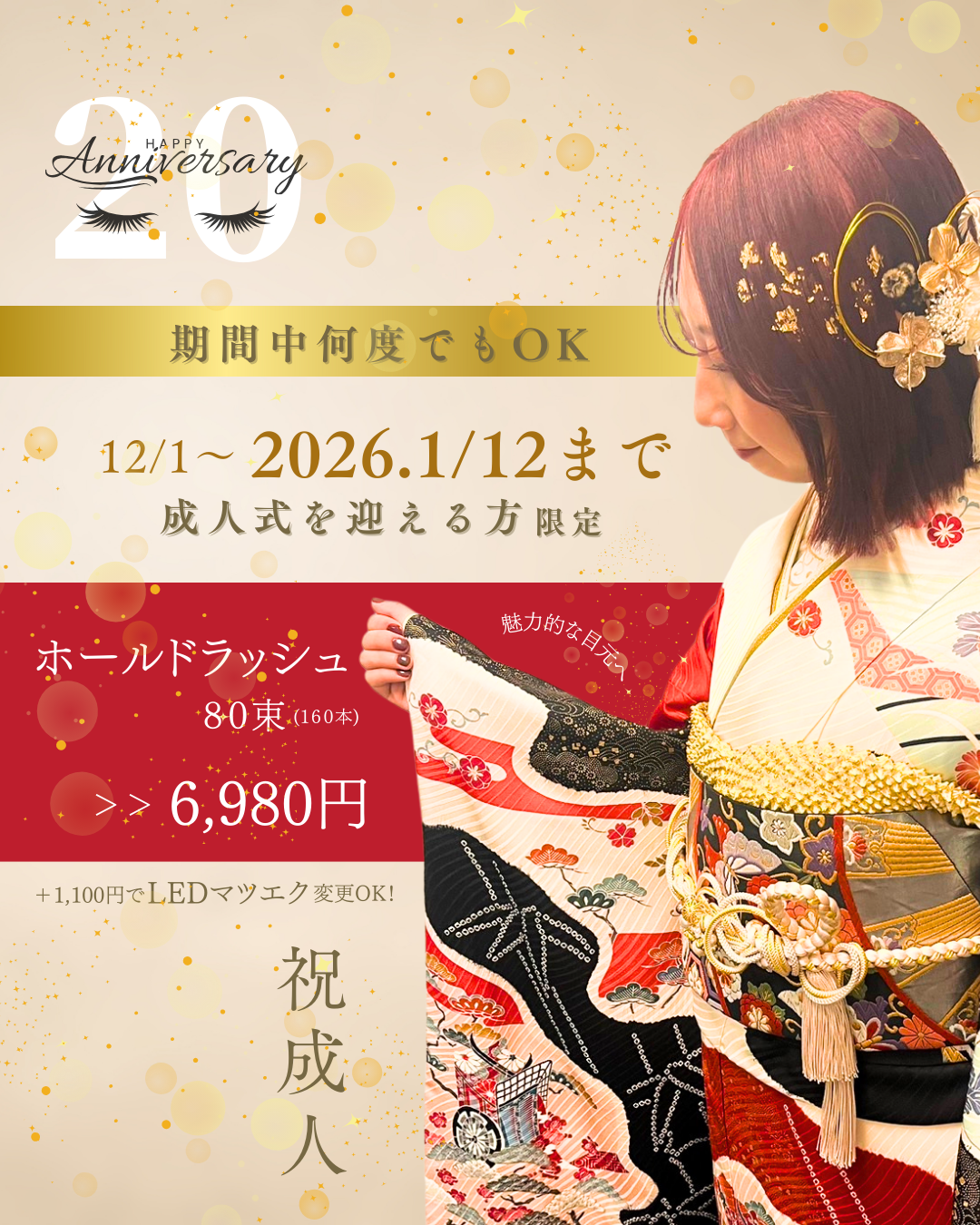 当サロンでは、人気の 高持続ホールドラッシュ160本(80束) にプラス 1,100円 でLEDマツエクに変更可能です。成人の日キャンペーン期間中のお得なキャンペーンなので、ぜひこの機会にお試しください✨