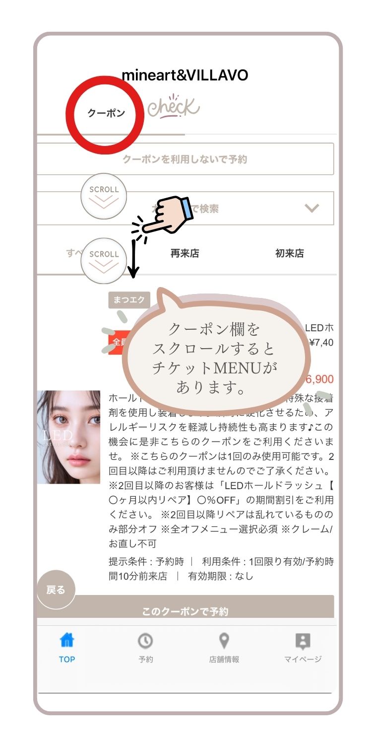 ②クーポン画面をスクロールすると【チケット】のクーポンがあります。(下部にあるのでスクロールすると出てきます。)