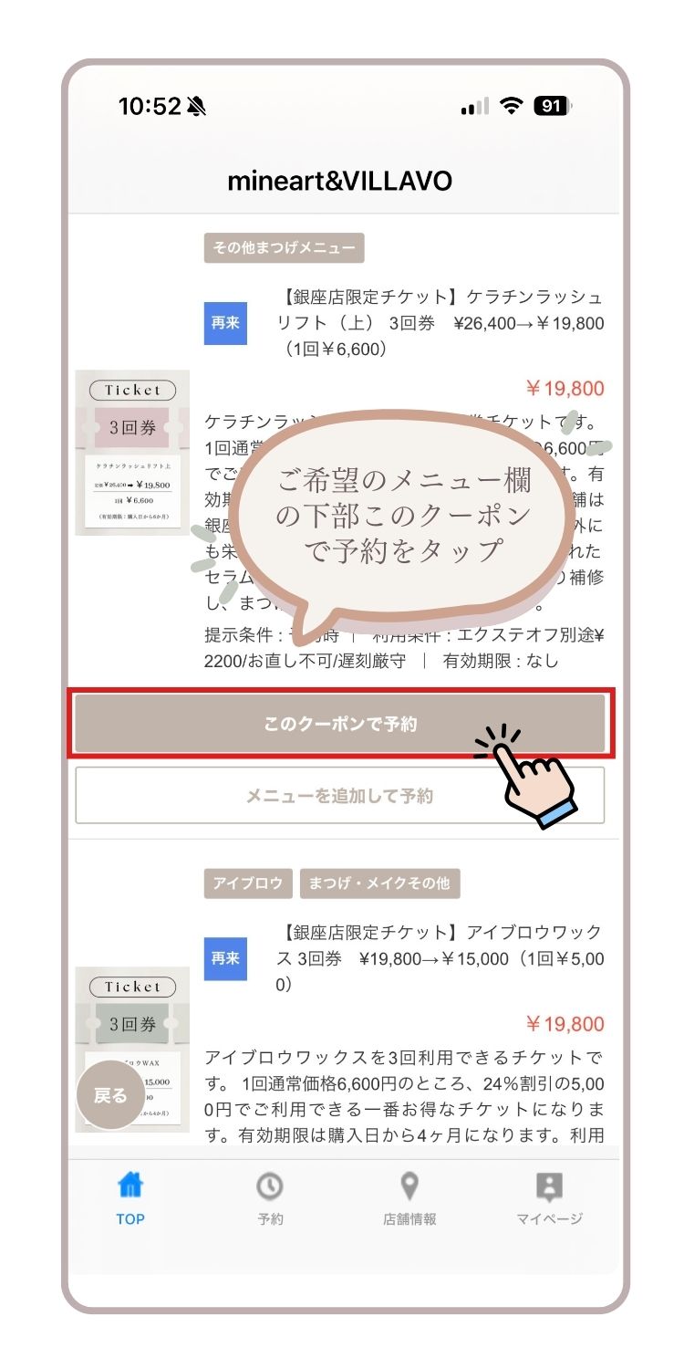 mineart&VILLAVO専用アプリでチケットを利用してのご予約が可能です。
